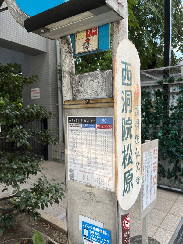 京都駅からですと、市バス50系統「西洞院松原」(にしのとういんまつばら)で降りると数分です。