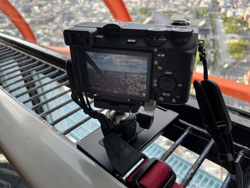 展望室のガラス窓の手前にちょうどカメラを置けるくらいの網状の台のようなものがあり、目線の高さよりかなり低いですが、うまく使うと手振れが防げます…