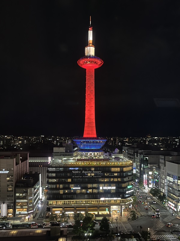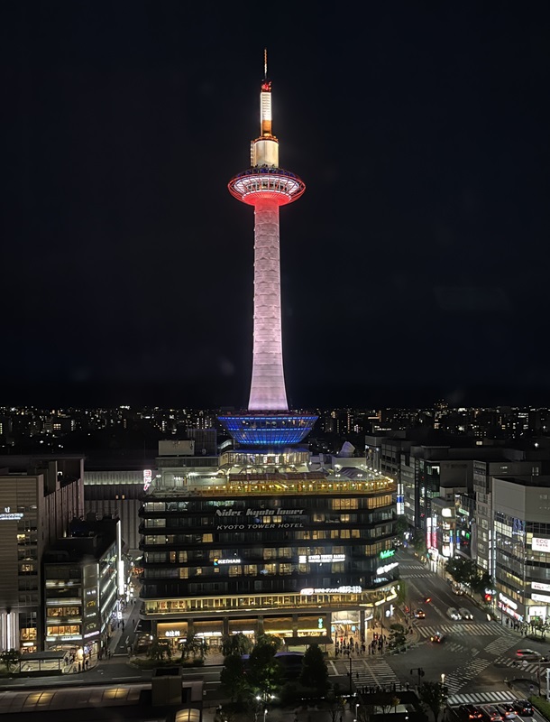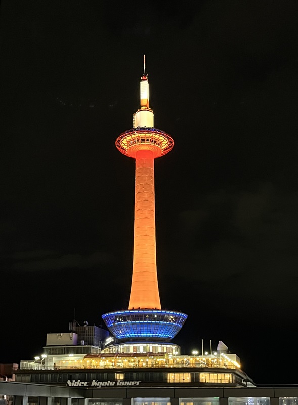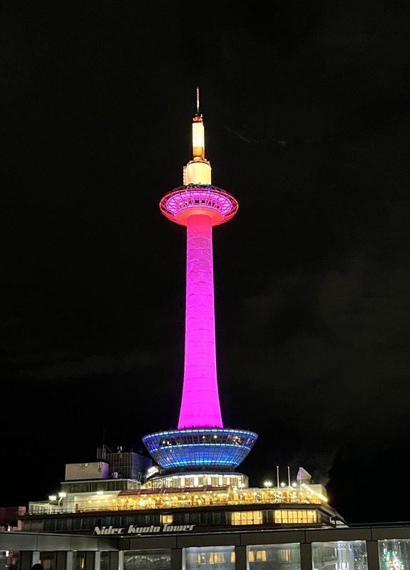 とにかく、最近の京都タワーは、イベントや社会活動だけでなく、個人・家族の記念日でもライトアップサービス(有料)があったりして、色付きのタワーが見られると得したような気分になります。