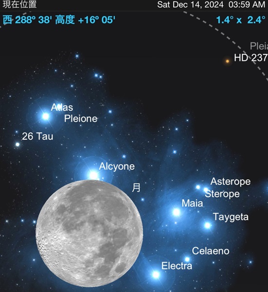 煌々と輝く月は、普段は肉眼ではっきり見えるプレアデス星団まで完全にかき消し