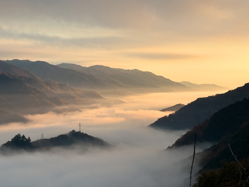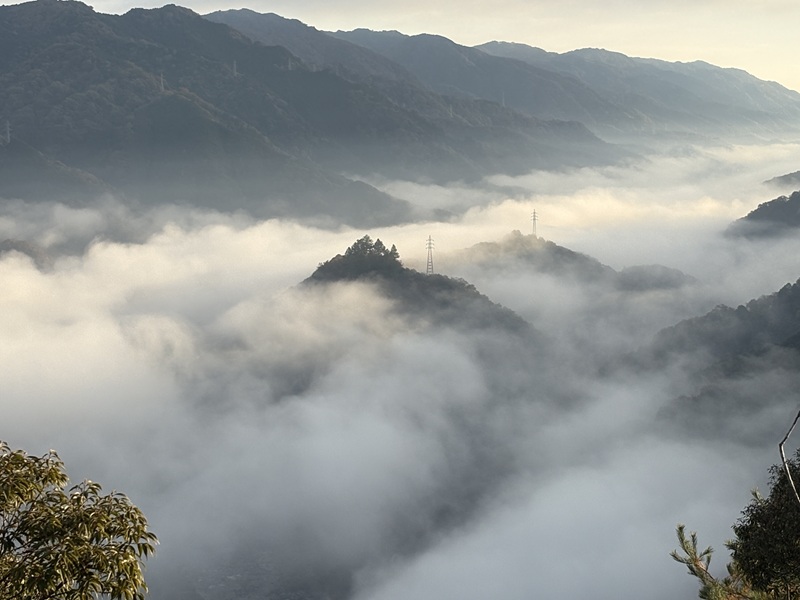 雲海と紅葉〜京都・笠置寺4〜 2025年11月24日 イベント 2025.11.282025.11.30 11月24日(月)午前6時晴のち曇、気温2℃、湿度97%、風速1m、昼間の最高気温18℃京都・笠置寺 静かな雲海平らだった雲海が時間の経過とともにうろこ雲のような形に変化雲海発生の条件は前日23日よりもよいと思うのだが、雲の量は昨日の方が圧倒的に多かった…気象予想の数字だけでは計れない条件があるようだ 車で帰り際、笠置寺近くの小さな滝に立ち寄り笠置寺の紅葉は見頃だったが、こちらはまだ青々…12月に再度訪れたい笠置寺もみじ公園の夜間ライトアップは12月14日(日)まで