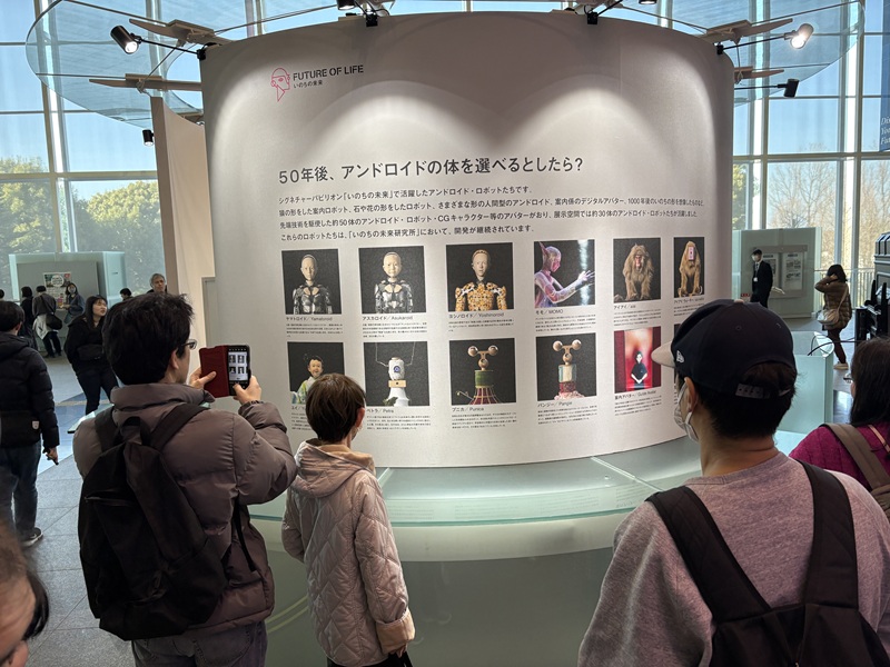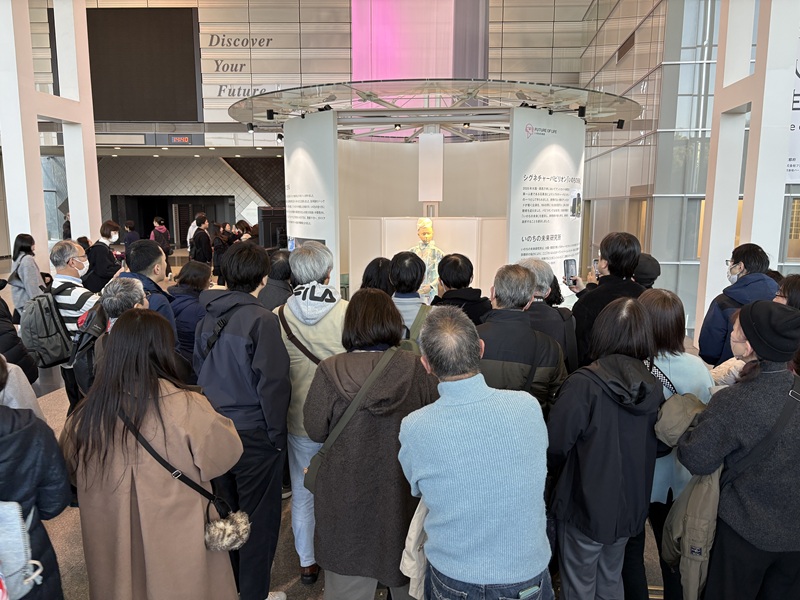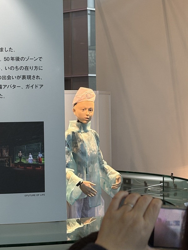 最初にホールで万博「いのちの未来」パビリオンのアーカイブ映像(約30分)鑑賞後、アンドロイド(2体)とパネル展示等を見学。