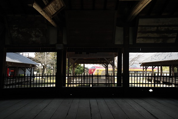 この神社で撮りたいと思った構図は、上下が極端に暗く、列車が真横に走る中央だけが極端に明るい。