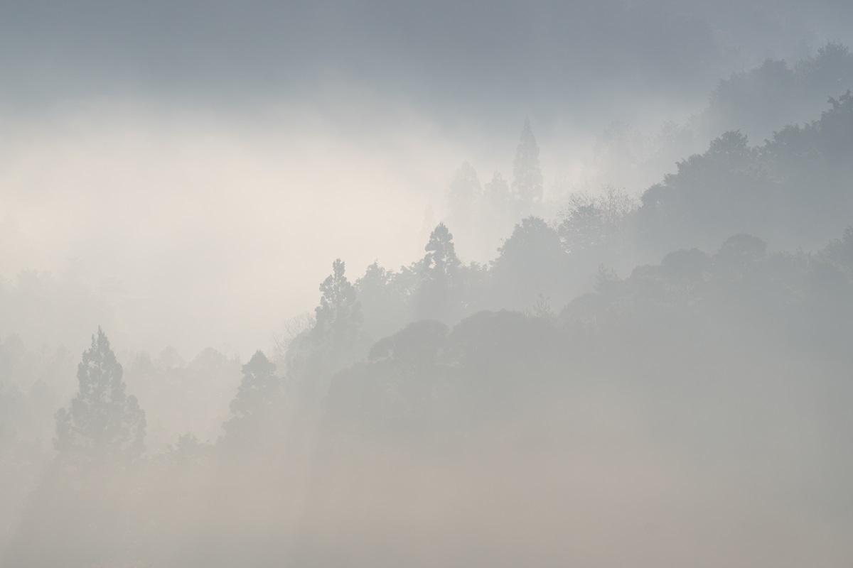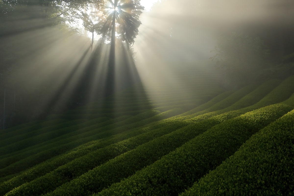和束町(京都府)原山の茶畑。前日に雨が降り、天気予報から朝は霧が出るだろうと予想。山を登ると、期待通り霧が発生しており、盛大な光芒に出会いました。※NHKワールドカレンダーフォトコンテスト「優秀作品賞」受賞(NHKワールドカレンダー2016年(壁掛)「5月」採用)