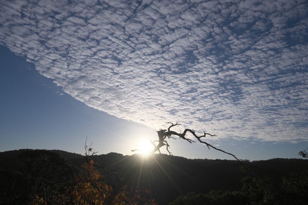 (右)笠置山の日の出。この日は、鱗雲が大きな丸い形のまま南から北へと移動し、見応えのある風景を撮影できました。