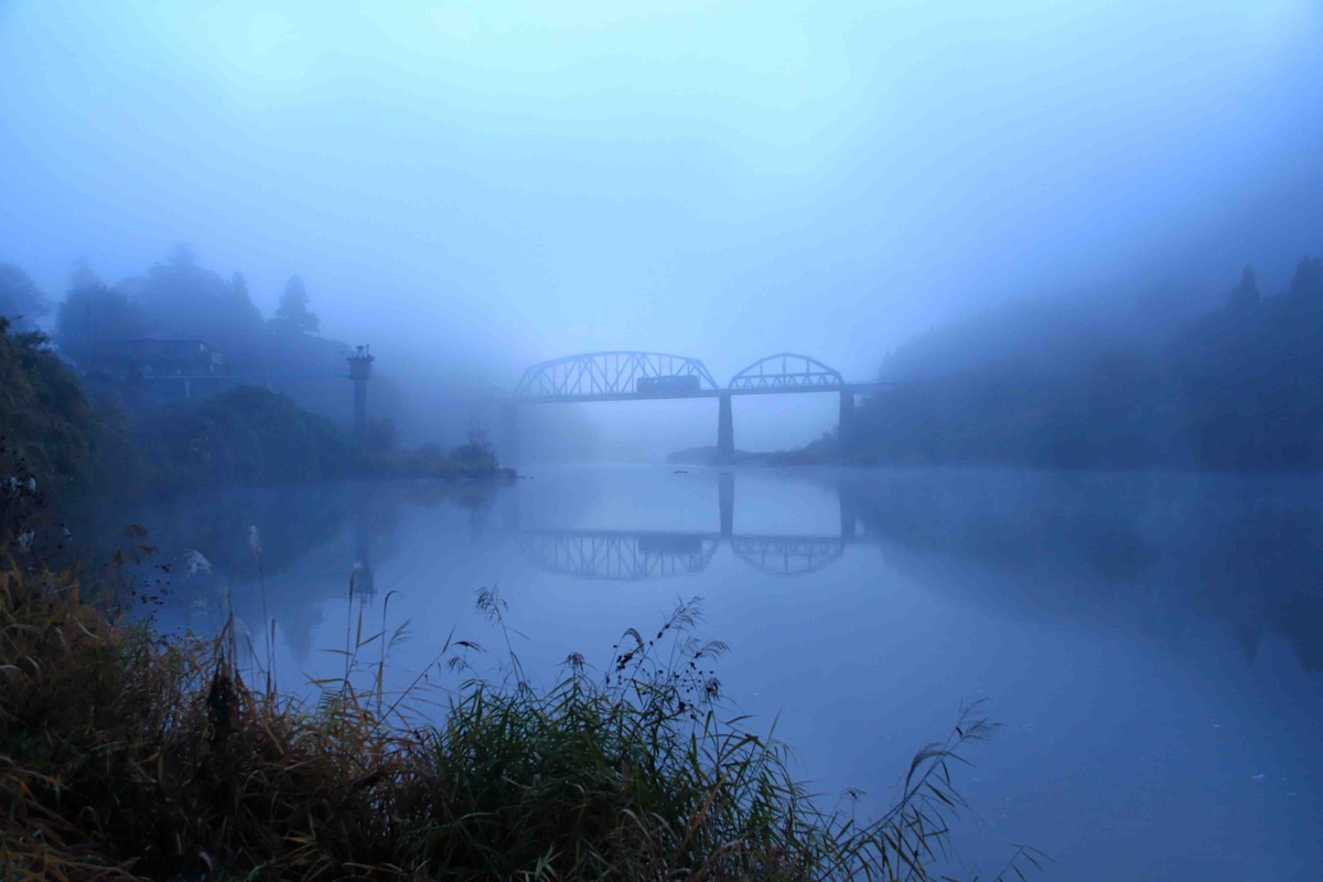 秋、度々霧に包まれるJR関西本線の木津川橋梁。ゴトン、ゴトンという車輪の音が峡谷に響き、幻想的な風景を堪能できます。