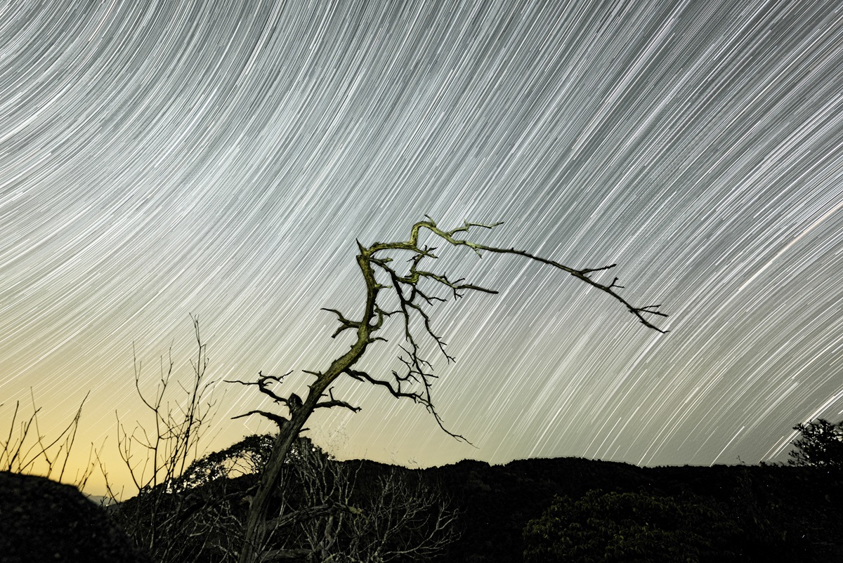笠置寺(京都府笠置町)の星景写真(比較明合成)。この龍をイメージする形の良い木は、笠置寺の平等岩付近にあります。今は右側だけに枝が伸びていますが、元々は左側にも立派な枝があったようです。岩に挟まれた非常に狭い場所からしか見ることができないため、撮影にはいつも苦労します。