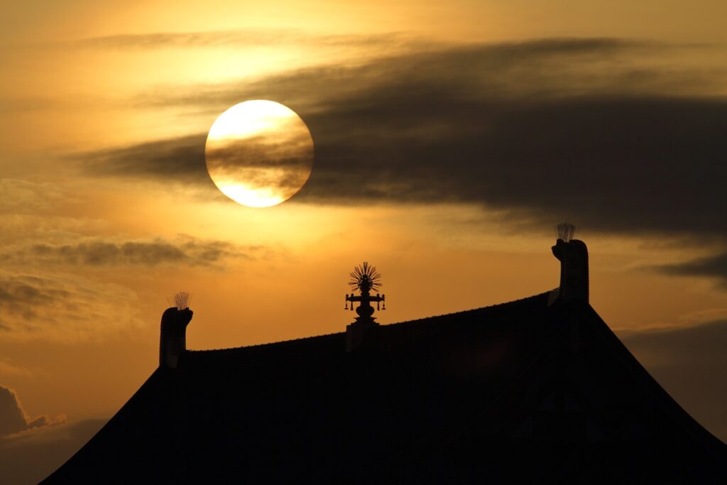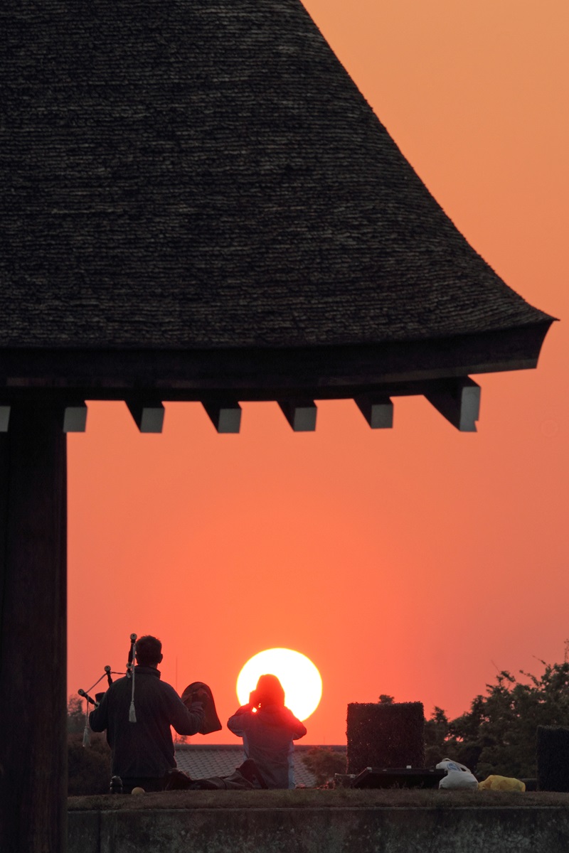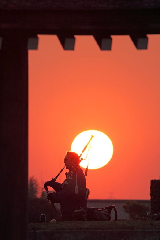 (左・中)休日の夕暮れに平城宮跡に行くと、スコットランド人の男性がバグパイプを吹く姿をよく見かけた。何度も聞いているうちに、撮影だけでなく、その音色を聞くのが楽しみになった。隣の写真の夕陽に重なる女性はハーモニカを吹く日本人の奥様。数か月後、この写真を差し上げたらとても喜んでくれた。この時、写真のデータをメールで送る約束をしアドレスを聞いたのだが、うまく送信できず、未だに約束を果たせていないのが心残り。※2013年頃
